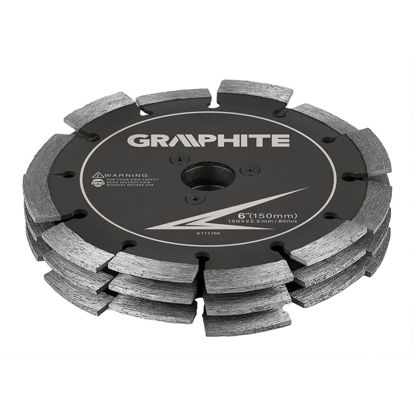 A GRAPHITE 57H696 kombinált tárcsa az 59G371 cikkszámú burkológéphez tervezett tárcsa. A 150 mm átmérőjű, 22,2 mm-es rögzítőfurattal rendelkező hármas szett betonba történő hornyoláshoz készült - nincs szükség vésésre. A kereszt alakú szegmensek tiszta, 30 mm széles rést hoznak létre, így könnyen egyenletes barázdákat lehet létrehozni. A GRAPHITE fűrészlap 36 szegmenssel rendelkezik, a gyémántszegmensek magassága 9,5 mm, teljes szélessége 27 mm, maximális fordulatszáma pedig 10 200 rpm. A termék megfelel az EN 13236 szabvány követelményeinek, ami megerősíti a beton megmunkálására való alkalmasságát.
