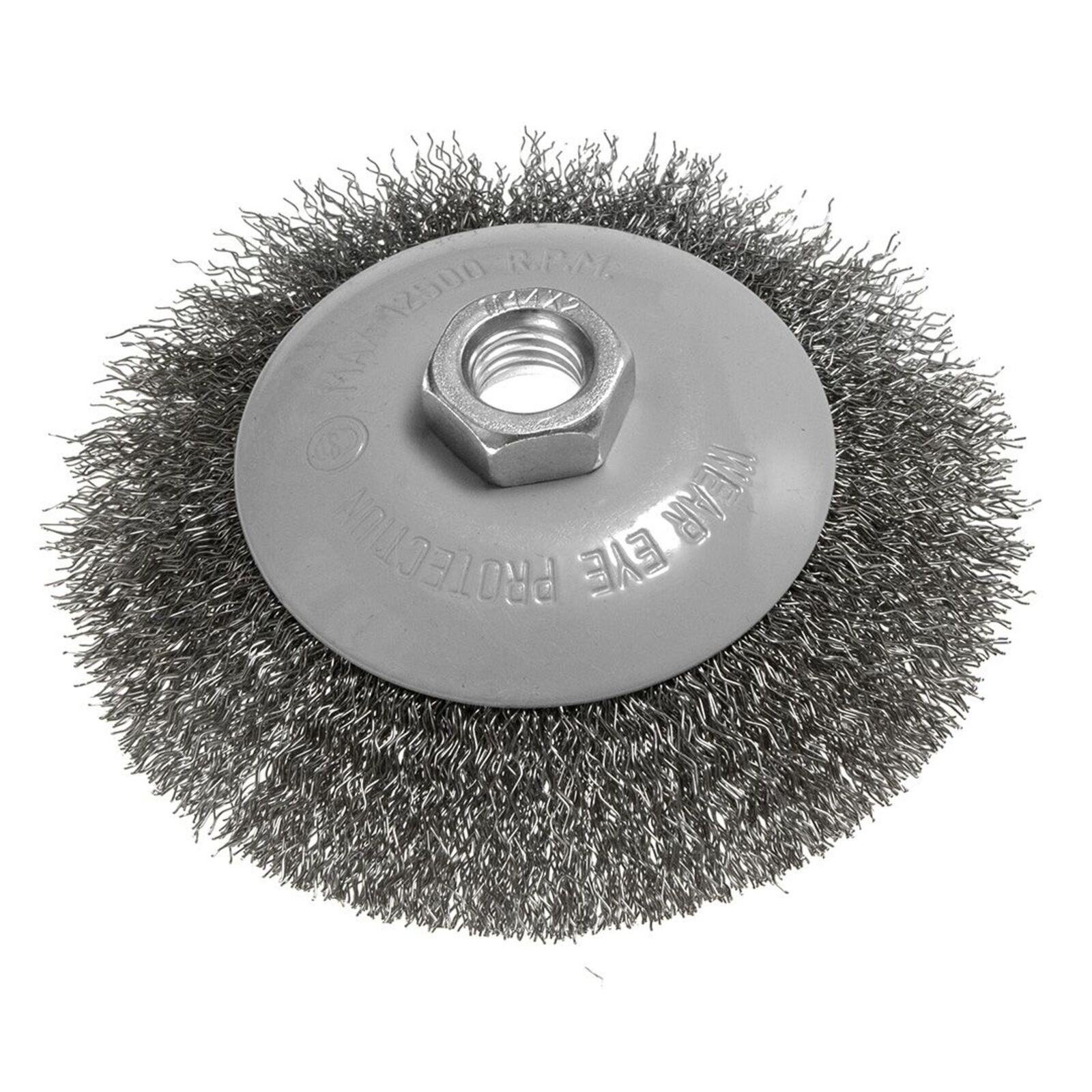 A GRAPHITE 115 mm átmérőjű drótkerékkefe, krimpelt acélhuzal, M14, 57T436 krimpelt acélhuzalból készül. M14-es menettel van ellátva, és sarokcsiszolókkal való használatra tervezték. A szerszám maximális fordulatszáma 12500 fordulat/perc. A termék megfelel az EN 1083-2 szabványnak, és kiválóan alkalmas fémfelületek megmunkálására, tisztítására, rozsda, festék vagy szennyeződés eltávolítására.