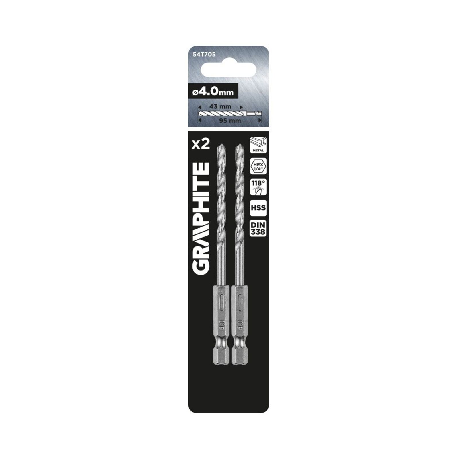 GRAPHITE Csigafúró, 1/4" hatszög szárral, HSS DIN 338, 4mm, 2db/cs. Fúrókészlet fémek megmunkálásához. 4 mm átmérő, 95 mm teljes hossz, 43 mm munkahossz jellemzi. Megfelel a DIN 338 szabványnak, és 118 fokos élszöggel rendelkezik. A fúrók profi és amatőr alkalmazásban is jól működnek.
