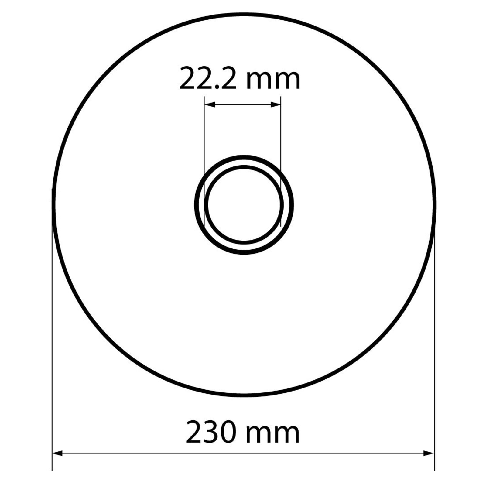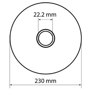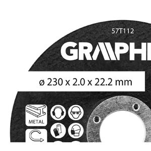 Vágótárcsa, korund fémekhez 230 x 2 x 22,2 mm, 41 A46-S-BF, 57T112 a GRAPHITE által fémek vágására tervezett alumínium-oxid korong. Méretei 230 x 2 x 22,2 mm. Ez a modell lapos kialakítású és a 41 A46-S-BF jelöléssel rendelkezik. A tárcsa vastagsága 2 mm, a rögzítőfurat átmérője pedig 22,2 mm. A maximális fordulatszám 6600 rpm, ami 80 m/s sebességnek felel meg. A termék megfelel az EN 12413 szabványnak.