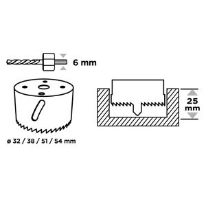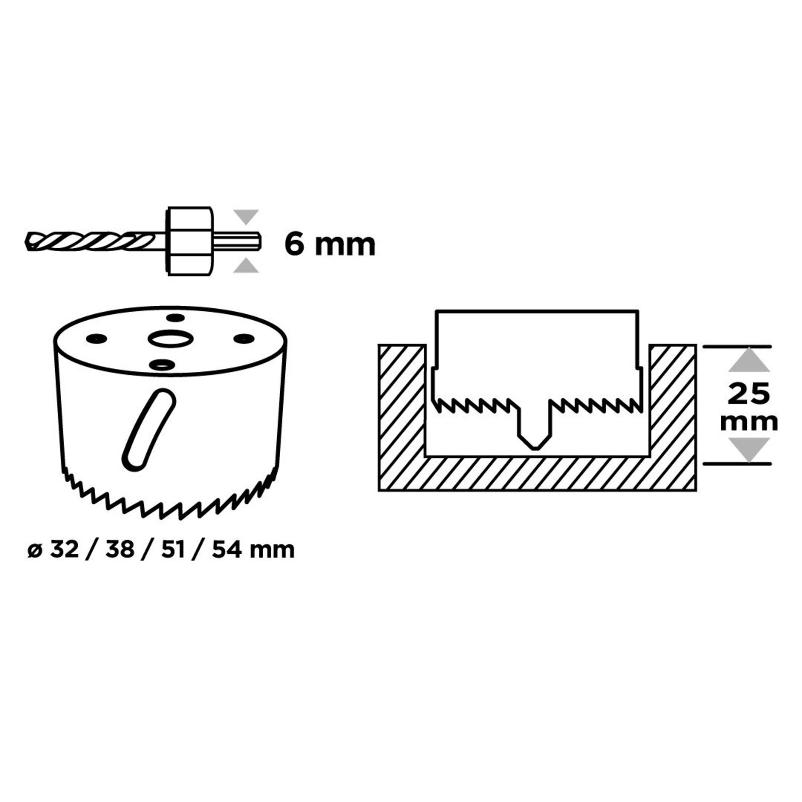 Lyukfűrész adapterrel, 32-54 mm, 6 darabos készlet 56T722 GRAPHITE hat darabot tartalmaz. A készlet átmérőjű lyukfűrészeket tartalmaz: 32 mm, 38 mm, 51 mm és 54 mm. Tartalmaz - egy adapter 6 mm átmérőjű próbafúrószárral és egy imbuszkulccsal, lehetővé teszi a szélesebb körű használatot. Az egyes lyukfűrészek magassága 28 mm, a fúrási mélység pedig 25 mm. A maximális fordulatszám működés közben 1100 rpm. A GRAPHITE márkájú készletet fúrógép vagy fúró/ütőgép segítségével fába, műanyagba és gipszkartonba történő lyukfúráshoz tervezték.