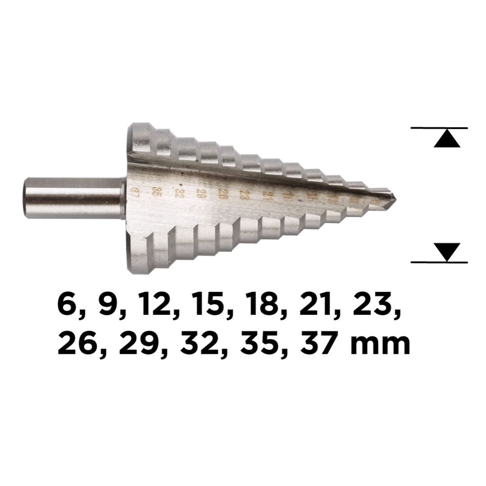GRAPHITE 54T305 Lépcsős fúró, HSS, 6-37mm. Segítségével 6 és 37 mm közötti átmérőjű furatokat készíthet. Tökéletes szerszám fémlemez, műanyag és fa megmunkálásához. Profi és hobbi használatra egyaránt ajánlott.