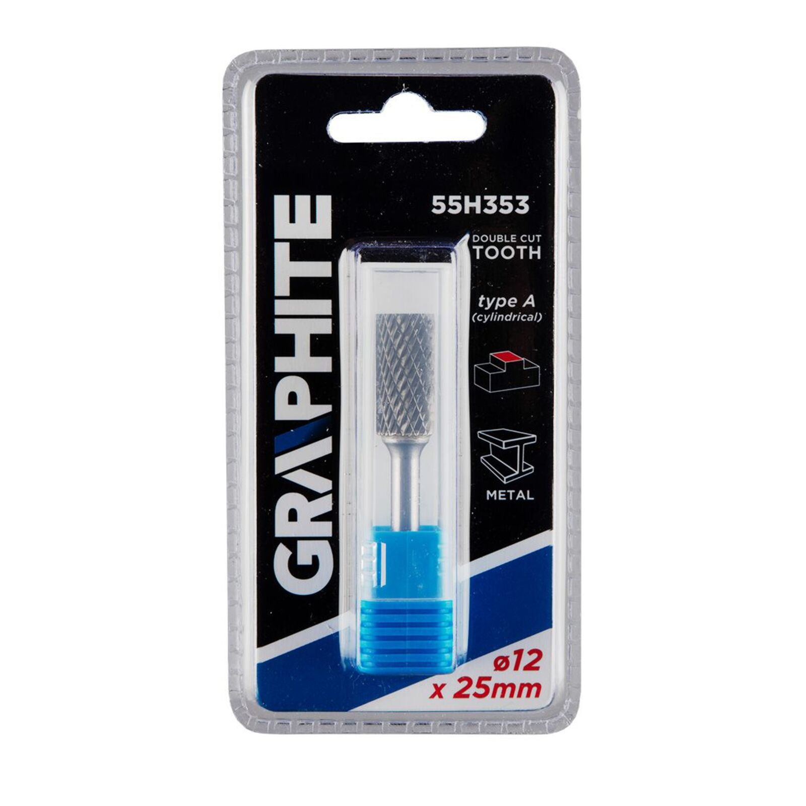 Keményfém marófej, A típusú (hengeres), 12 x 25 mm, 55H353, GRAPHITE - kiváló minőségű, a megmunkálandó felület marására vagy vágására szolgáló szerszám. Fém, alumínium és műanyag megmunkálására tervezték. Egyenes csiszolókkal használható (ne használja fúróval).