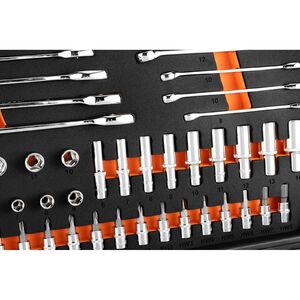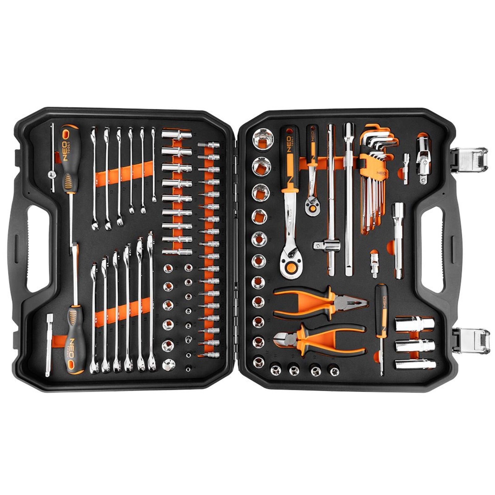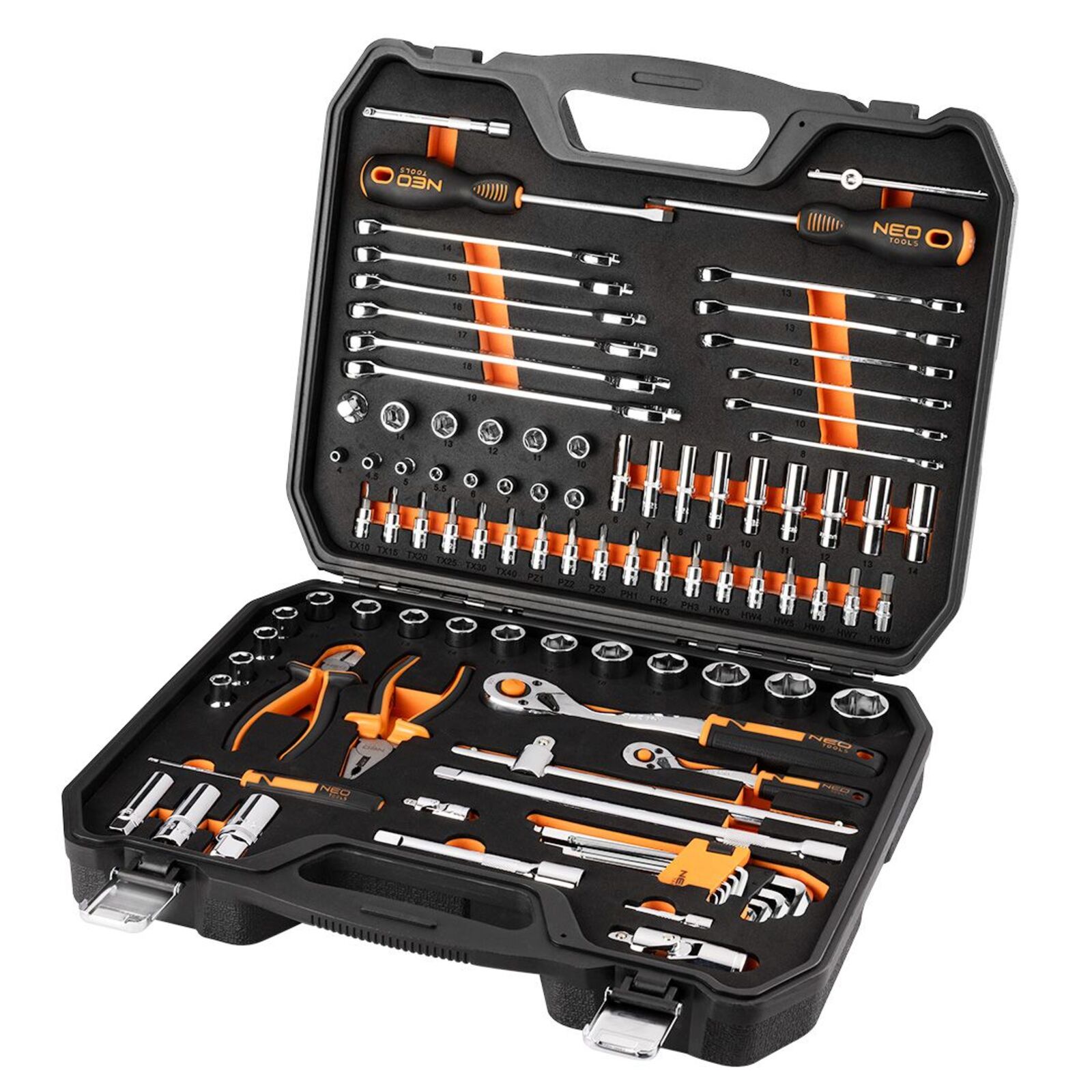 Kulcskészlet EVA-habban 95 szerszám 10-065 a NEO TOOLS-tól egy 95 szerszámból álló készlet, amely egy EVA-habos tokban van elhelyezve. A készlet ½" rövid hatlapos dugókulcsokat tartalmaz (15 db): 8, 10 (2 db), 11, 12, 13 (2 db), 14, 15, 17, 18, 19, 22, 24, 27 mm; 90T ½" racsni (1 db); ½" hosszabbítók (2 db): 125, 250 mm; dugókulcs dugószeggel ½" (T-bar) 250 mm (1 db); kardáncsukló ½" (1 db); gyertyákhoz 3/8" (1 db): 14 mm; hatszögletű foglalat ½" gyertyákhoz (2 db): 16 mm, 21 mm; ½"F x 3/8 "M adapter (1 db). A NEO TOOLS készlet tartalmazza továbbá: rövid ¼" hatszögletű dugókulcsok (13 db): 4, 4,5, 5, 5,5, 6, 7, 8, 9, 10, 11, 12, 13, 14 mm; hosszú ¼"-os hatszögletű dugókulcsok (9 db): 4, 4,5, 5, 5, 5,5, 6, 7, 8, 9, 10, 11, 12, 13, 14 mm; hosszú ¼"-os hatszögletű dugókulcsok (9 db): 90T ¼" racsni (1 db); ¼" hosszabbítók (2 db): 6, 7, 8, 9, 10, 11, 12, 13, 14 mm: (1 db); ¼" (T-bar) dugókulcsgomb 115 mm (1 db); ¼" kardáncsukló (1 db); ¼" dugókulcsgomb (1 db); ¼" dugókulcsok (18 db): PZ1, PZ2, PZ3, PH1, PH2, PH3, TX10, TX15, TX20, TX25, TX30, TX40, H3, H4, H5, H6, H7, H8. A készlet a következőket is tartalmazza: csavarkulcsok (12 db:) 8, 10 (2 db), 12, 13 (2 db), 14, 15, 16, 17, 18, 19 mm; univerzális fogó 160 mm (1 db); oldalfogó 160 mm (1 db); csavarhúzók (2 db): SL6,5x100 mm, PH2x100 mm; hatlapos kulcsok (9 db): 1,5, 2, 2,5, 3, 4, 5, 6, 8, 10. Ez egy többcélú szerszámkészlet minden profi és barkácsoló számára.