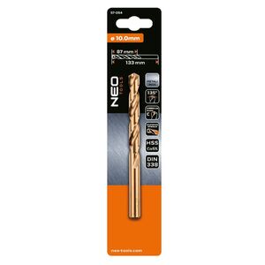A NEO TOOLS 57-054 HSS-Co 10 mm-es fémfúrófeje a DIN 338 szabvány szerint mélyen csiszolt, M35 acélból készült, 5% kobalt hozzáadásával. 135°-os csúcsszöget és C típusú nyírási korrekciót alkalmaz. Hengeres fogantyúval rendelkezik. A munkarész hossza 87 mm, teljes hossza 133 mm. A maximális sebességek a következők: INOX 375-400 fordulat/perc, általános fémek 750-800 fordulat/perc. Ennek a NEO TOOLS márkájú fúrószárnak a célja az olyan igényes anyagok fúrása, mint a rozsdamentes, saválló és hőálló acél.