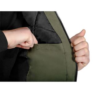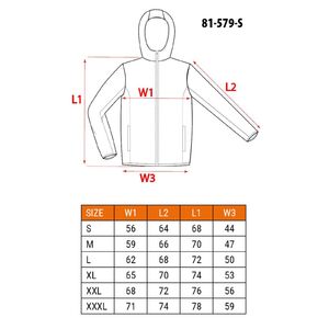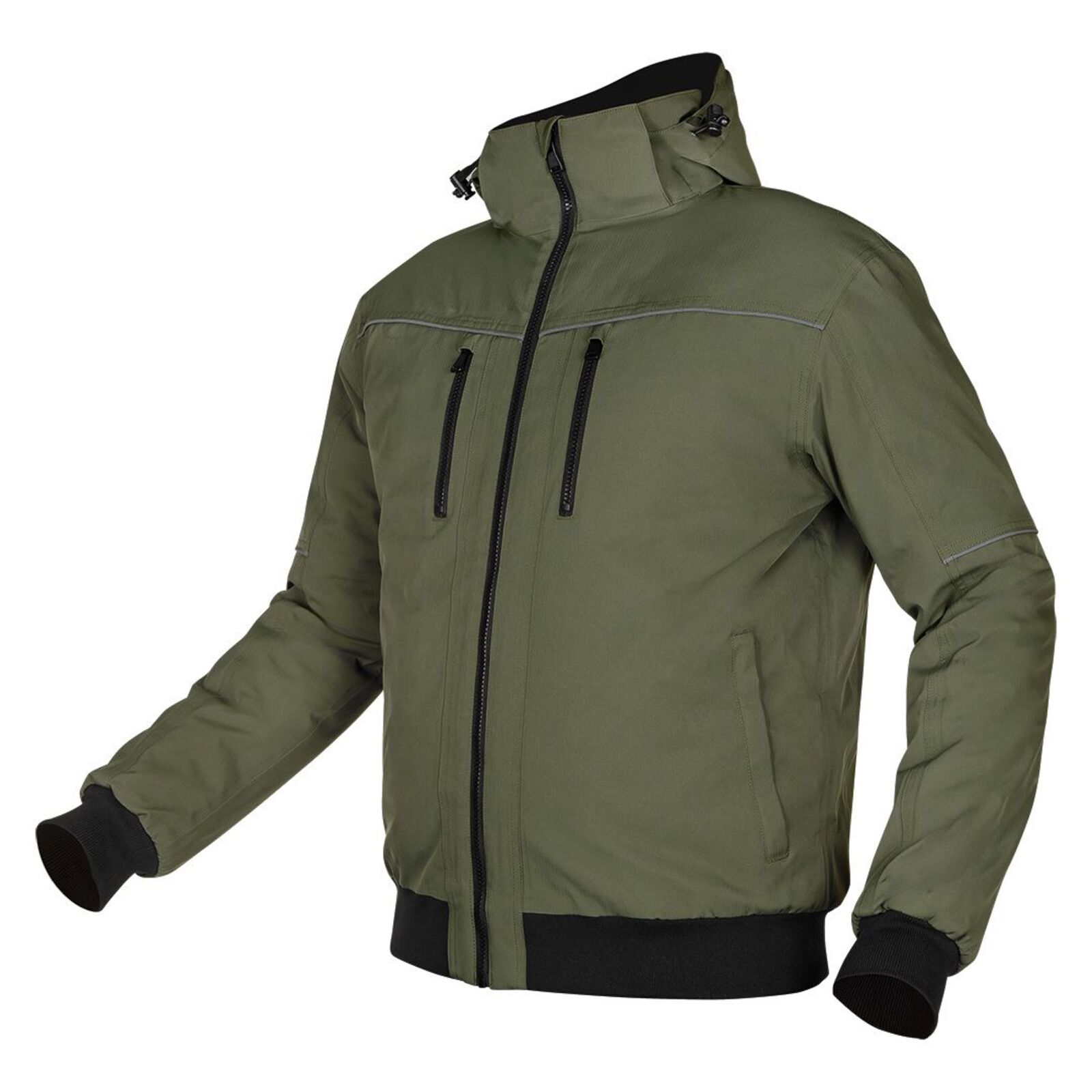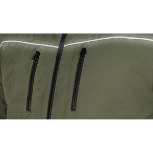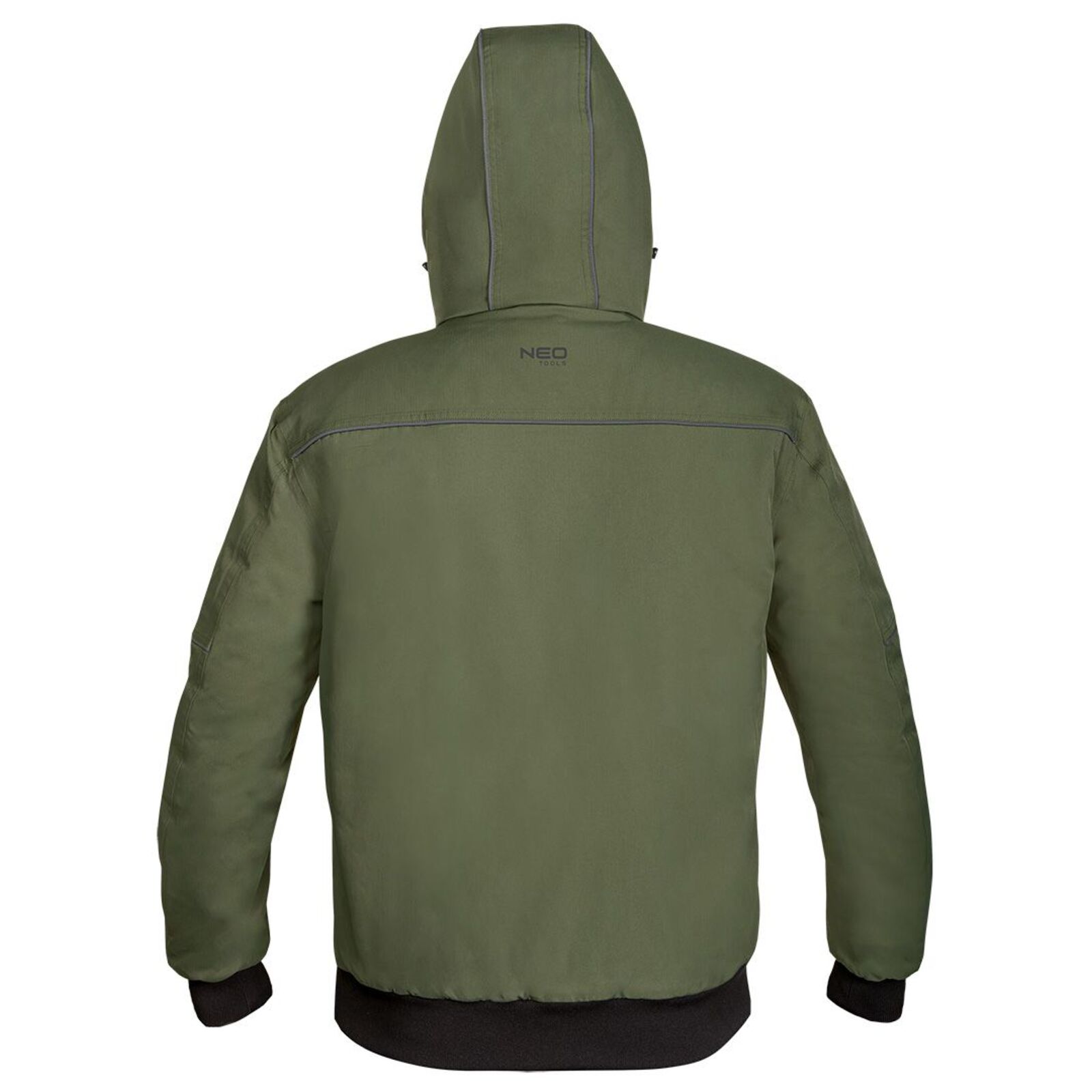 NEO 81-579 Téli munkavédelmi kabát, OUTDOOR, hőszigetelt, kapucnis, zöld. "Bomber" típusú szigetelt kabát, amely 100% poliészter összetételű, mini halszálkás elasztomultészter anyagból készült. A főszövet 190 g/m2 és a bélés 180 g/m2 tömegű. A NEO TOOLS kabát mellkasi és oldalsó cipzáras zsebekkel rendelkezik. Elől és hátul fekete színű fényvisszaverő csíkkal van ellátva. Az ujjakon lévő fényvisszaverő csík, valamint a kabát ujjain és alján lévő bordázat szintén fekete színű. A beépített, állítható kapucni jól véd a szél és a hideg ellen. A kabát nyakán nyomtatott logó és névtábla található a jobb személyre szabhatóság érdekében a munkahelyen.