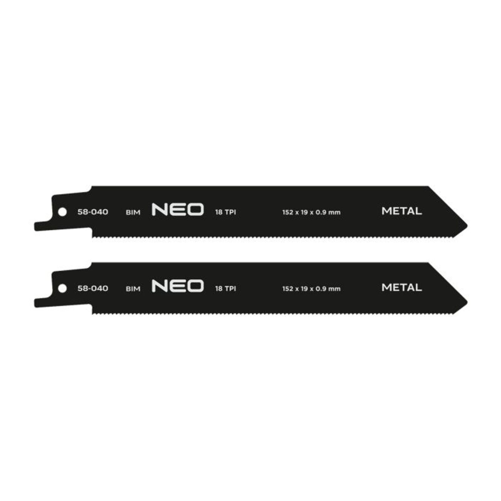 Szablyafűrészlapok, BIM, 152 x 19 x 0,9 mm, 18 TPI, 2 darabos készlet 58-040 a NEO TOOLS-tól két BIM technológiával készült fűrészlap, amelyek 18 TPI-vel és 152 x 19 x 0,9 mm-es méretekkel rendelkeznek (fogköz 1,4 mm). Igényes anyagok egyenes vágásához tervezték őket: vékony fémlemezek (1,5-4 mm), nyitott/zárt csövek és profilok (5-100 mm átmérőjű). A rugalmas kialakítás javítja a vezetésvezérlést és a tartósságot a legkülönbözőbb szelvényekkel való munka során.