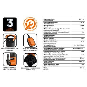 A NEO TOOLS 04-745 szennyezett víz búvárszivattyú 400 W, teljesítmény 8000 l/h a NEO TOOLS praktikus eszköze a víz kiszivattyúzásához épületekből vagy pincékből, valamint a vízkivételekből (pl. kutakból) a célállomásokra történő vízszállításhoz. Jellemzője a 400 W teljesítmény és a 8 000 l/h kapacitás. A NEO TOOLS szivattyú maximális merülési mélysége 5 m, a maximális vízemelkedés pedig 7 m. A készülék a szivattyúzás után 30 mm vizet hagy, és a kezelt szennyeződések legnagyobb lehetséges átmérője nem haladhatja meg a 25 mm-t. A NEO TOOLS merülőszivattyú alumíniumból (motorház), valamint üvegszál-erősítésű nejlonból (a fő ház esetében) készül. A maximálisan támogatott vízhőmérséklet 35 Celsius fok. A készülék kerámia orsótömítéssel és hosszú, 10 méteres gumiból készült tápkábellel is rendelkezik. Támogatja a ∅25, ∅32, 1", 1 ½" átmérőjű csapokat. A NEO TOOLS márka szennyezett vizes merülőszivattyúja hasznos megoldás az építkezők, vízvezeték-szerelők, gazdálkodók, valamint mindazok munkájához, akiknek rövid idő alatt nagy mennyiségű vizet kell kiszivattyúzniuk.