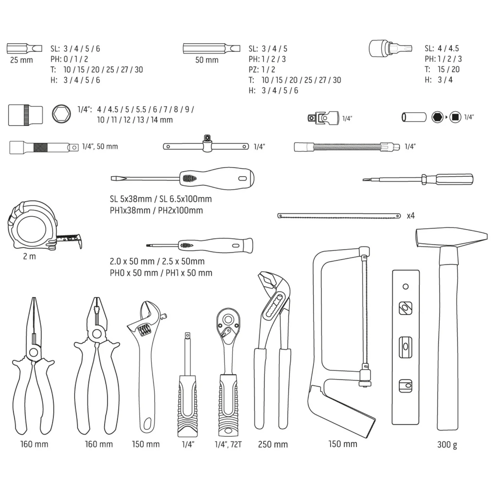 A NEO TOOLS 10-202 szerszámkészlet 88 darabból áll, amelyek kiváló minőségű króm-vanádium acélból készültek. A készlet tartalmaz egy 1/4"-os racsnit tartós, 72 fogas mechanizmussal és ergonomikus markolattal. A szettben megtalálhatók többek között ¼”-os dugókulcsok (4–14 mm méretben), valamint különböző csavarhúzó bitek (lapos, kereszt, hatszög, Torx). A kiegészítők között szerepel egy állítható villáskulcs, vízmérték, 2 méteres mérőszalag, bitfogantyú, kalapács, univerzális, lapos és vízpumpa fogó, feszültségvizsgáló, 4 normál és 4 precíziós csavarhúzó. A teljes készlet egy masszív, műanyag hordtáskában kerül forgalomba.