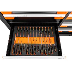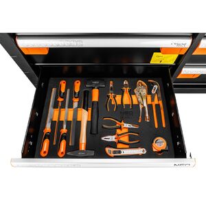 NEO 84-225 MŰHELYKOCSI, PRO, 12 FIÓKOS, SZERSZÁMKOCSI. A NEO 84-225 PRO műhelyszekrény egy robosztus és jól szervezett szerszámkocsi, amely kiváló minőségű anyagokból készült és számos praktikus funkcióval rendelkezik. Az alábbiakban részletesen a termék jellemzői: Méretek (kerekekkel): 110,5 x 46,5 x 97,8 cm, Méretek (kerekek nélkül): 82,5 cm magas. Fiókok: 6 nagy fiók (3 alacsony: 560 x 400 x 60 mm, 3 magas: 560 x 400 x 139 mm), 6 kis fiók (3 alacsony: 252,5 x 400 x 60 mm, 3 magas: 252,5 x 400 x 139 mm), Teherbírás: 600 kg, Anyag: Acéltest, Felületkezelés: Alumíniumlap a csavarhúzóknak és tartozékoknak, oldalsó perforáció kampóknak és egyéb NEO termékeknek, Funkcionális Kiegészítők: Sarokütközők, Oldalsó fogantyú, Fiókzár, Nyithatóság: 100%-os nyithatóságú fiókok golyóscsapágyazott csúszkákkal, Kompatibilitás: NEO márkájú szerszámbetétekkel kompatibilis, Munkafelület: 2 mm magas EVA szőnyeg a fiókokban, Zárrendszerek: Központilag zárható, Kerékzár a biztonságos munkavégzéshez, Kerekek: Tartós kerekek a könnyű mozgáshoz, Ideális szerszámok, csavarok, és kisebb alkatrészek tárolására és szállítására műhelyekben és szerszámosokban. A NEO márkájú PRO műhelyszekrény ellenálló és tartós kivitelezése biztosítja a hosszú élettartamot. A központilag zárható fiókok és a kerékzár növelik a biztonságot a munkavégzés során. A NEO 84-225 PRO műhelyszekrény egy megbízható és professzionális megoldás a szerszámok hatékony tárolására és szállítására. A 12 fiókos kivitel sokféle eszköz és alkatrész elhelyezésére teszi alkalmassá. A kerekek könnyű mozgást biztosítanak, míg a kiváló minőségű anyagok és a gondos tervezés garantálják a hosszú évekig tartó használatot.