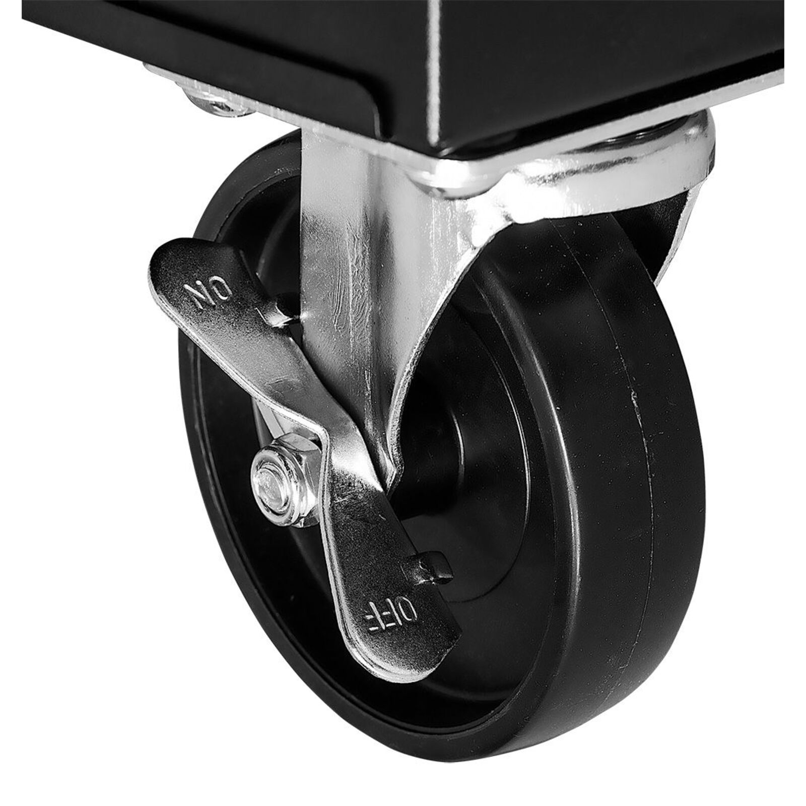 NEO 84-214 Műhelykocsi, 5 fiókos, 680x460x825mm, szerszámkocsi. A kocsi 5 praktikus szerszámtartó fiókot tartalmaz, melyek központi zárral zárhatók. A fiókok teljesen kihúzhatóak, vezető görgőn mozognak, amelyek biztosítják a hosszú élettartamot és a folymatos és üzembiztos működést. A munkapad felület gumi burkolattal van ellátva, mely ellenáll az olaj és az egyéb kenőanyagok behatásainak. A négy colos forgóvillás görgők megkönnyítik a kocsival történő manőverezést, egyben blokkolhatók is. Terhelhetősége 280 kg. A kocsi a vezetést segítő fogantyúval is ellátásra került.