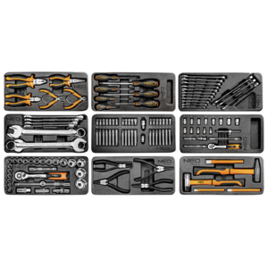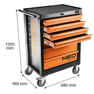 NEO 84-222-9 Műhelykocsi, 7 fiókos, 129db szerszámmal, 680x460x1030mm, szerszámkocsi. Robusztus acéltesttel, központi zárral, gumibetéttel a tetején és golyóscsapágyas fióksínekkel rendelkezik. A nagy átmérőjű, 125 mm-es kerekeknek és az oldalsó fogantyúnak köszönhetően könnyen manőverezhető. Kétkulcsos központi zárral rendelkezik. A kocsit a következő cikkszámú betétekkel kínáljuk: 84-230, 84-232, 84-234, 84-235, 84-236, 84-237, 84-238, 84-240, 84-242. Ez az optimális NEO TOOLS készlet, amely a legtöbb szereléshez javításhoz szükséges elemet tartalmazza. A műhelykocsit szakembereknek és barkácsolóknak egyaránt ajánljuk.